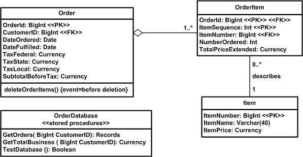 (GetOrders, GetTotalBusiness, and TestDatabase), and a trigger on Order named deleteOrderItems. The figure also depicts