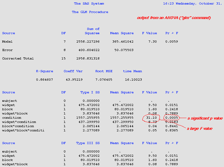 Here's a portion of the sample script's output corresponding to the results of the ANOVA. As can by seen, the "condition" variable has a significant effect on the "time" variable (see comments in sample script for more explanation).